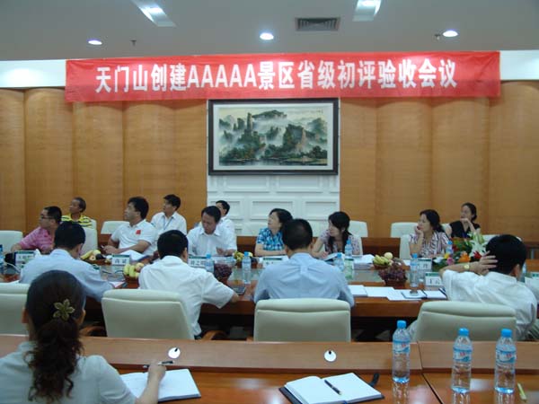 8月12日上午,天門山創(chuàng)建AAAAA景區(qū)省級初評驗收會議在天門山索道下站會議室召開。省旅游局副局長劉之明,省旅游局規(guī)劃處處長尚斌,省旅游局規(guī)劃財務(wù)處處長李志斌,省旅游局規(guī)劃財務(wù)處副處長黃可,省旅游局規(guī)劃財務(wù)處副主任科員王朝暉以及衡陽市旅游局規(guī)劃科科長王玲代表省評定組出席了會議。張家界市副市長肖凌之,張家界永定區(qū)區(qū)長陳競,張家界永定區(qū)副區(qū)長張在峰,張家界市旅游局局長丁云勇,張家界市旅游局副局長谷中元,張家界區(qū)旅游局局長吳文斌等張家界市區(qū)相關(guān)領(lǐng)導(dǎo)也出席了會議。