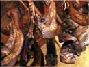 湘西土家人對腌臘制品有一種特殊的嗜好。每年一到冬至,家家戶戶都要殺年豬,做臘肉。下水鮮吃,正肉、豬頭、豬腳全部用于做臘肉。土家臘肉的做法,首先將鮮肉砍成五六斤一塊的長條,然后放在大缸里(決不能用水洗),撒上鹽,淋入一些酒,再放入一些八角、花椒、辣椒之類的香料,最后用大石塊壓在上面進行腌制。為了使肉入味均勻,隔一兩天就要把肉翻一遍。一個星期后,鹽味、香味都滲透到了肉里,這時再把肉取出來熏烤。     |  |