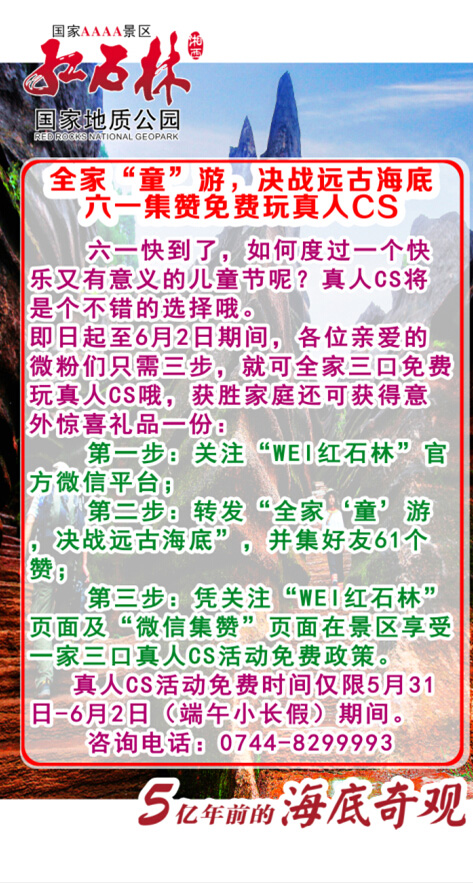 第三步:憑關(guān)注“WEI紅石林”頁面及“微信集贊”頁面在景區(qū)享受一家三口真人CS活動(dòng)免費(fèi)政策。