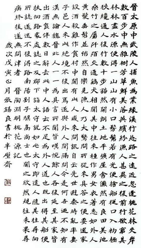 晉太元中,武陵人,捕魚為業(yè)。緣溪行,忘路之遠近,忽逢桃花林。夾岸數(shù)百步,中無雜樹,方草鮮美,落英繽紛。漁人甚異之,復(fù)前行,欲窮其林。林盡水源,便得一山。山有小口,仿佛若有光。便舍船從口入,初極狹,才通人。復(fù)行數(shù)十步,豁然開朗。土地平曠,屋舍儼然,有良田美池桑竹之屬,阡陌交通,雞犬相聞。其中往來種作,男女衣著,悉如外人。黃發(fā)垂髫,并怡然自樂。見漁人,乃大驚,問所從來,具答之。便要還家,設(shè)酒殺雞作食。村中聞有此人,咸來問訊。自云先世避秦時亂,率妻子邑人,來此絕境,不復(fù)出焉,遂與外人間隔。問今是何世,乃不知有漢,無論魏晉。此人一一為具言所聞,皆嘆惋。馀人各復(fù)延至其家,皆出酒食。停數(shù)日,辭去。此中人語云:“不足為外人道也”。既出,得其船,便扶向路,處處志之。及郡下,詣太守說如此。太守即遣人隨其往,尋向所志,遂迷,不復(fù)得路。南陽劉子驥,高尚士也,聞之,欣然規(guī)往,末果,尋病終。后遂無問津者。