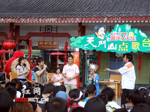 下午三點,節(jié)目錄制正式開始。在天門洞下的露天平臺上,央視著名主持人畢福劍——老畢以虛擬的“畢路電視臺天門山點歌臺”臺長的身份詼諧登場,他把他的“畢路電視臺”幽默的解釋為:姓畢的創(chuàng)辦的電視臺和必須錄制的節(jié)目,“畢路電視臺天門山點歌臺”這次請來了鄭智化和于文華兩位著名歌手,他們以觀眾點歌的形式,進行現(xiàn)場“PK”,充分展現(xiàn)“國慶七天樂,點歌也快樂”的節(jié)目主題。