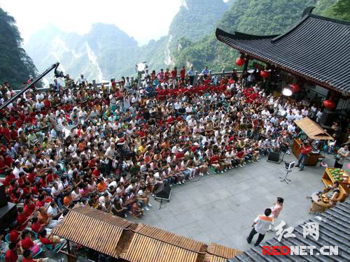紅網(wǎng)張家界8月22日訊(通訊員 周志強)8月21日下午,由著名制片人、主持人畢福劍率領(lǐng)的中央電視臺《夢想劇場》劇組在天門山景區(qū)錄制國慶特別節(jié)目——《國慶七天樂》。這次《國慶七天樂》的主題是“國慶七天樂,點歌也快樂”,老畢將點歌臺安置于天門山景區(qū)的天門洞,在秀美神奇的風景中與觀眾共享點歌聽歌的歡樂。
